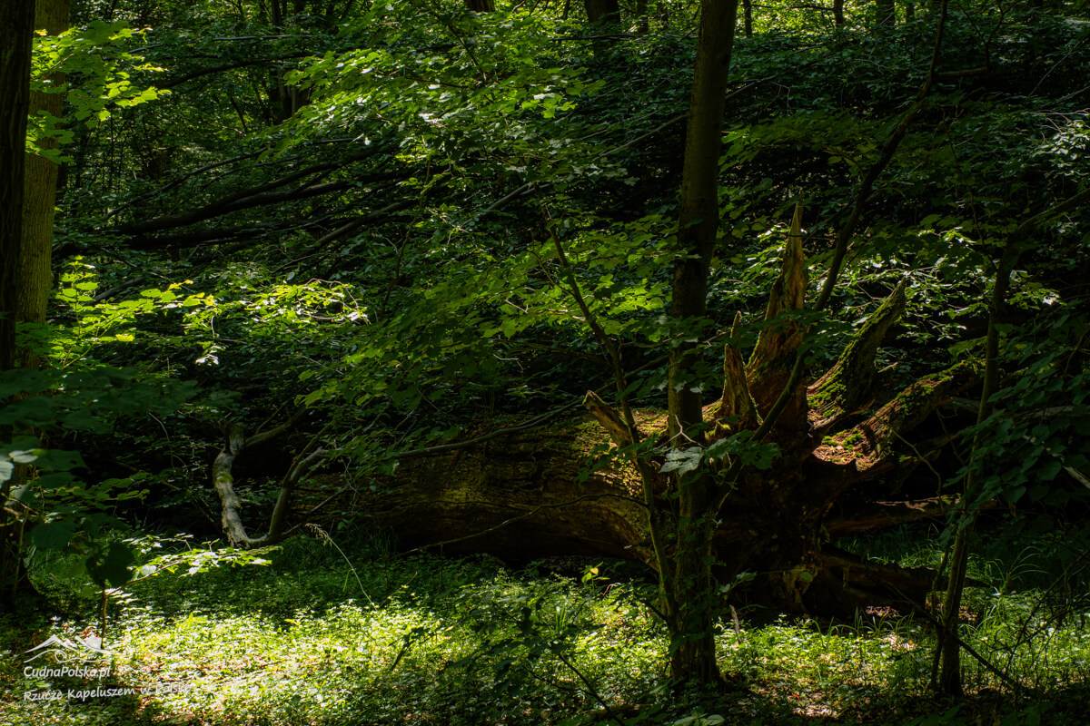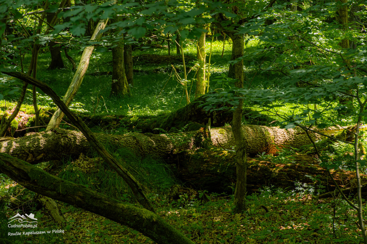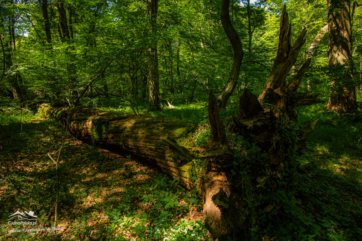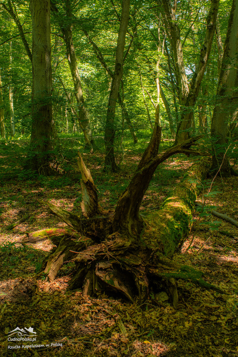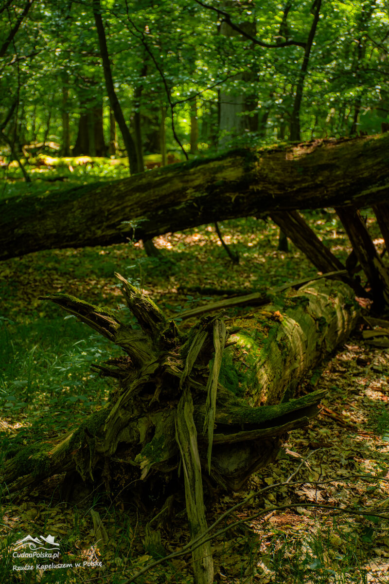 Po kilku minutach, z prawej strony można już podziwiać powalone, stare drzewa, można obejść polną dróżką dookoła wychodząc na wspomnianą drogę kilka rzutów kapeluszem na południowy zachód od punktu początkowego.