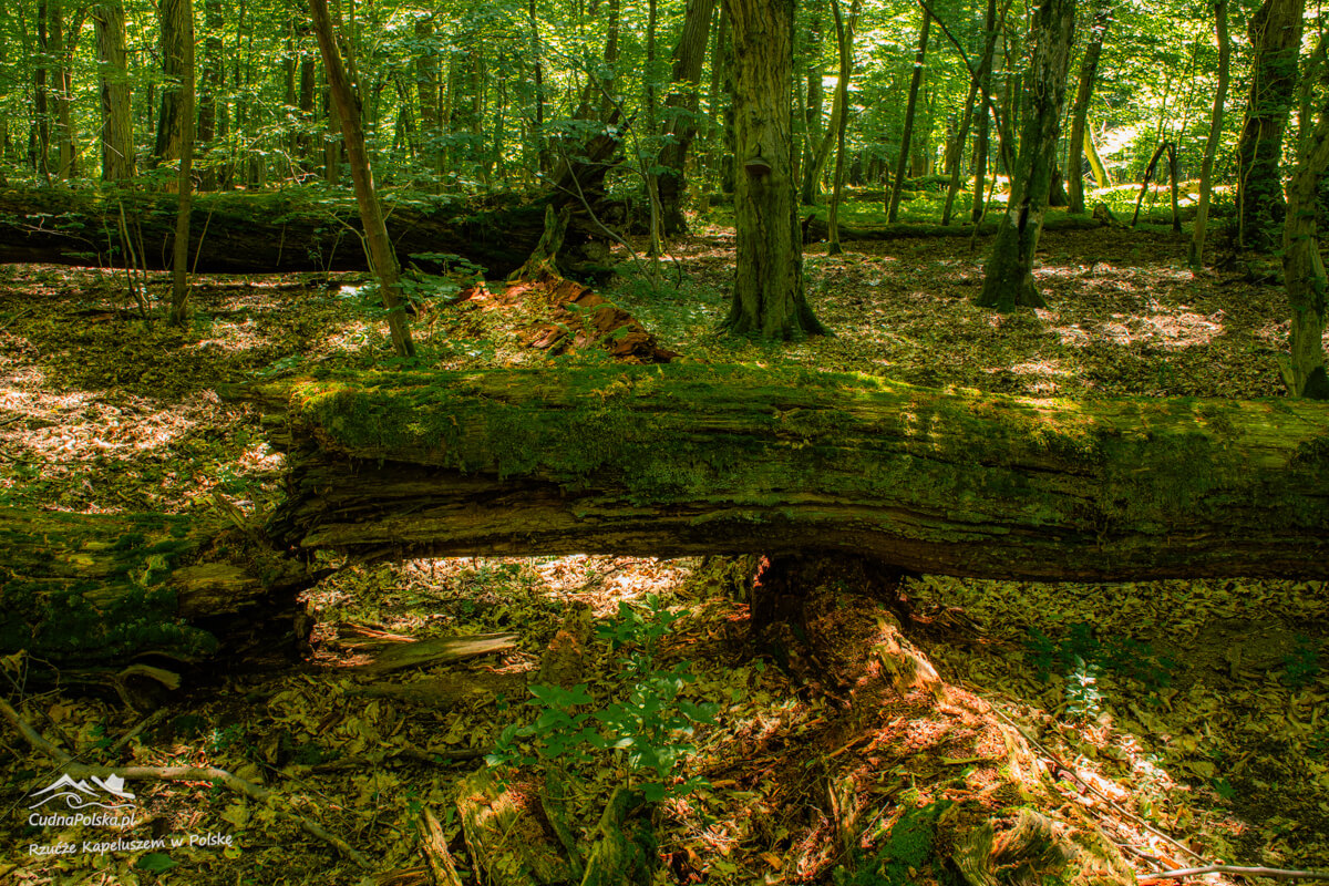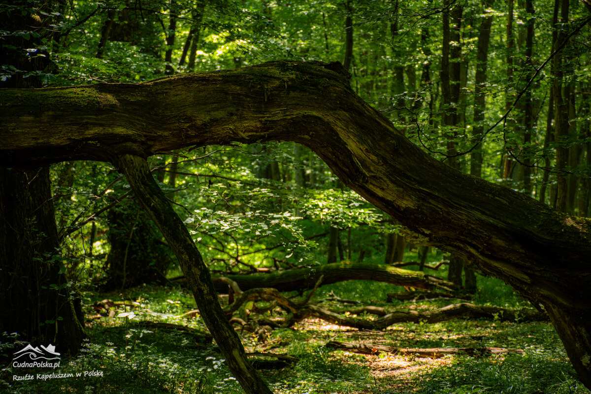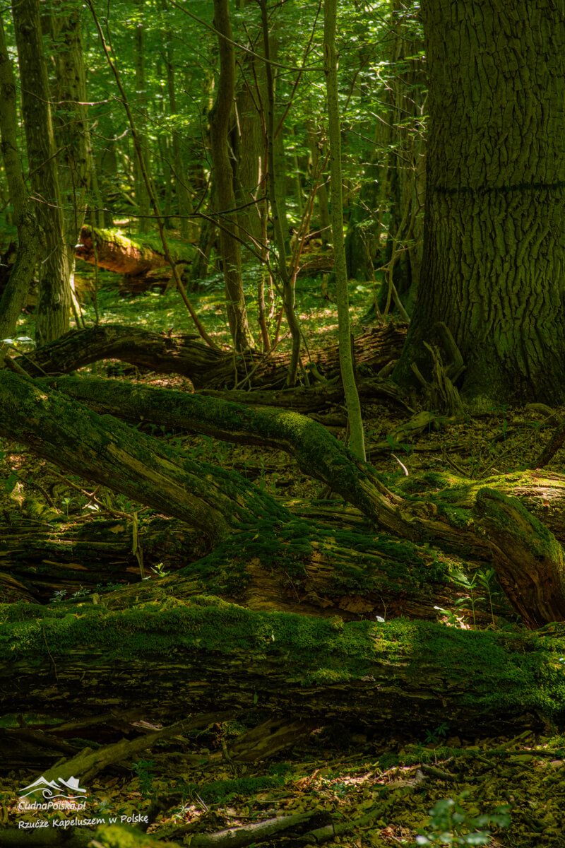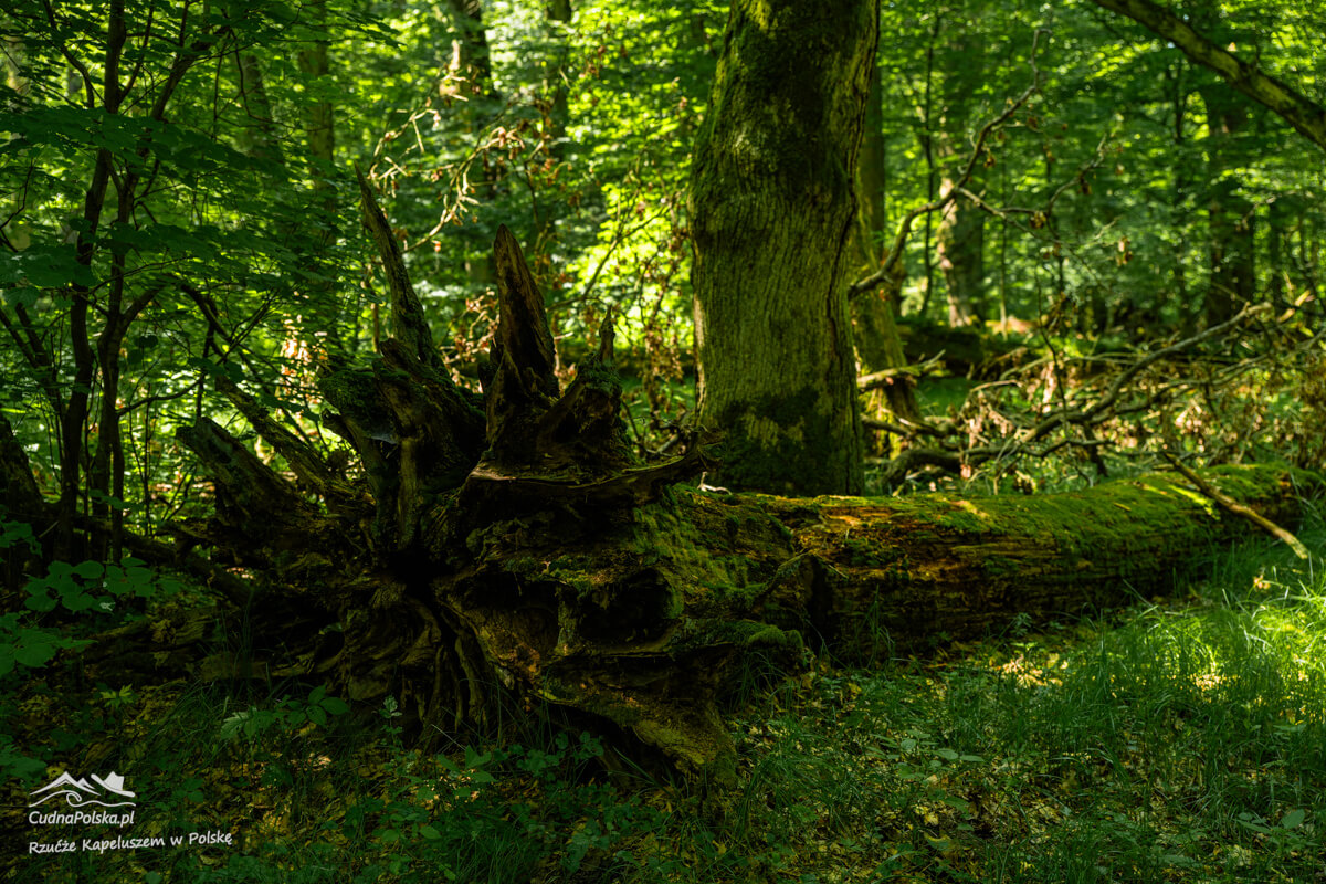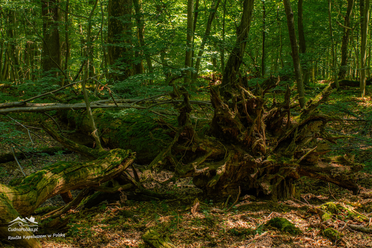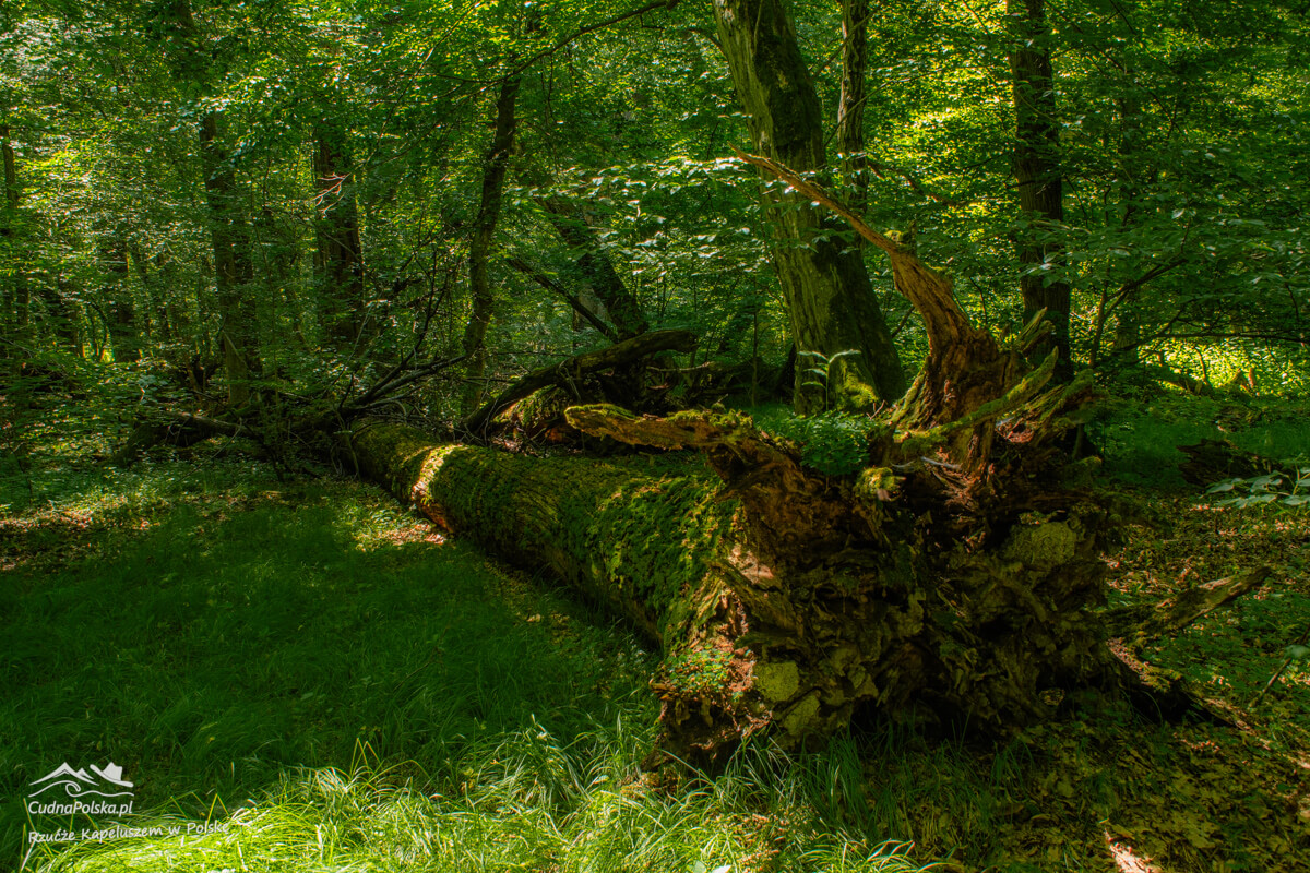 Po kilku minutach, z prawej strony można już podziwiać powalone, stare drzewa, można obejść polną dróżką dookoła wychodząc na wspomnianą drogę kilka rzutów kapeluszem na południowy zachód od punktu początkowego.